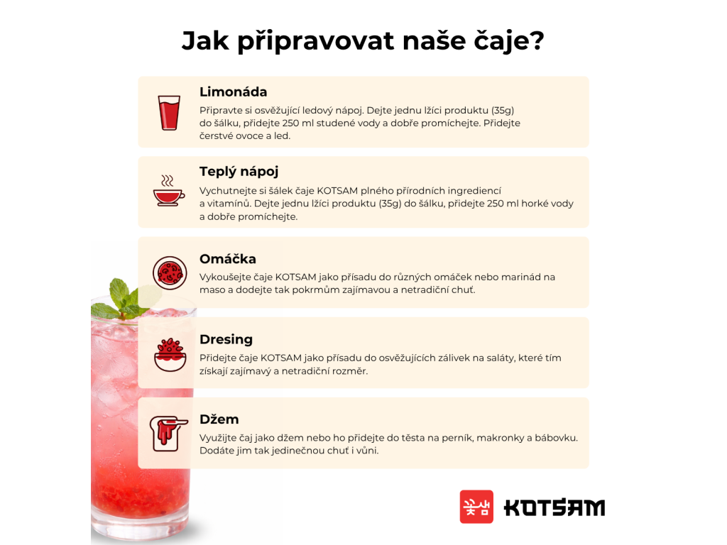 Dejte jednu lžíci produktu (35g) do šálku, přidejte 250 ml horké nebo studené vody a dobře promíchejte. (Množství vody lze upravit podle osobních preferencí) Pro více informací a různé způsoby přípravy navštivte náš blog!