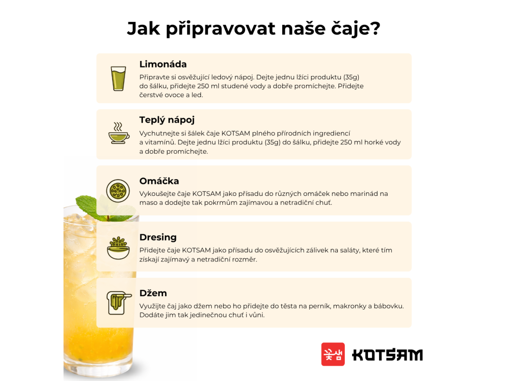Dejte jednu lžíci produktu (35g) do šálku, přidejte 250 ml horké nebo studené vody a dobře promíchejte. (Množství vody lze upravit podle osobních preferencí) Pro více informací a různé způsoby přípravy navštivte náš blog!