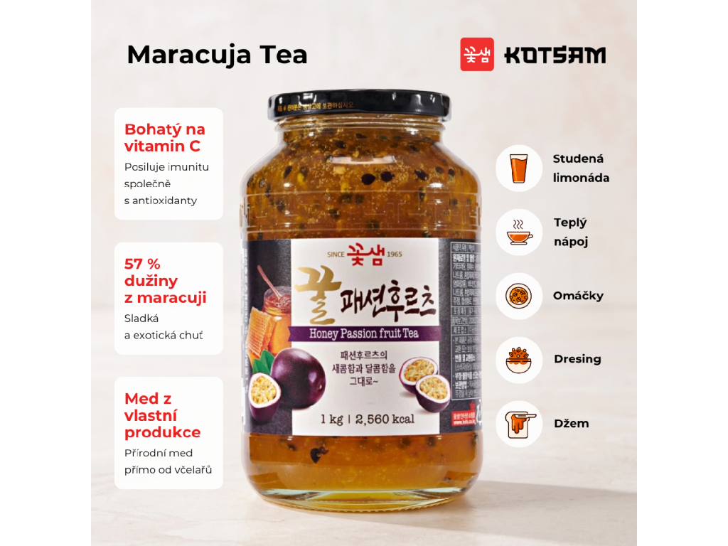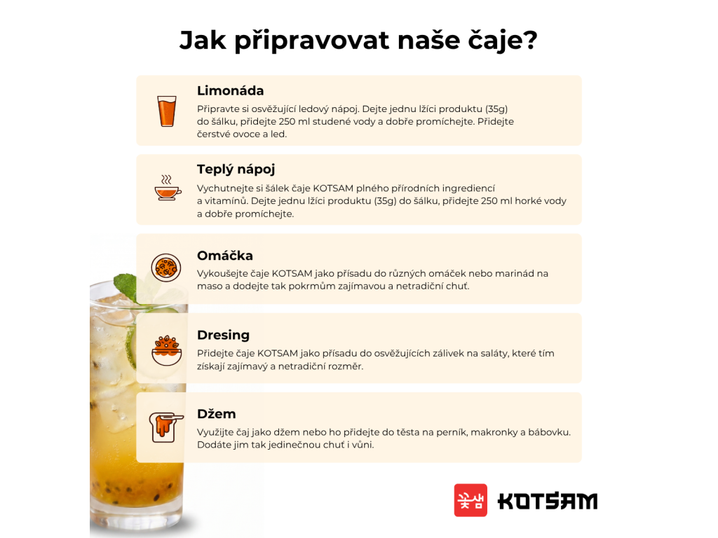 KOTSAM passion fruit čaj není jen o klasickém pití. Když ho namažeš na pečivo místo marmelády, získáš sladkokyselou chuťovou explozi. A jestli máš chuť na něco opravdu osvěžujícího, klidně si ho připrav jako ledový nápoj nebo limonádu. Zkrátka máš nekonečně možností, jak si užít jeho skvělou chuť a vůni.